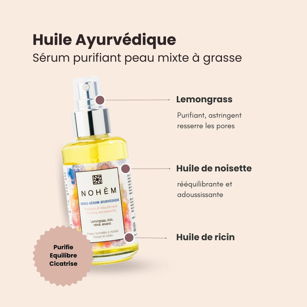 Notre huile purifiante ayurvédique bio est spécialement conçue pour répondre aux besoins des peaux grasses, mixtes et à problèmes. Véritable alliée du quotidien, elle purifie et nettoie l’épiderme en profondeur, tout en rééquilibrant la production de sébum pour un grain de peau affiné et un teint plus net, matifié et éclatant.