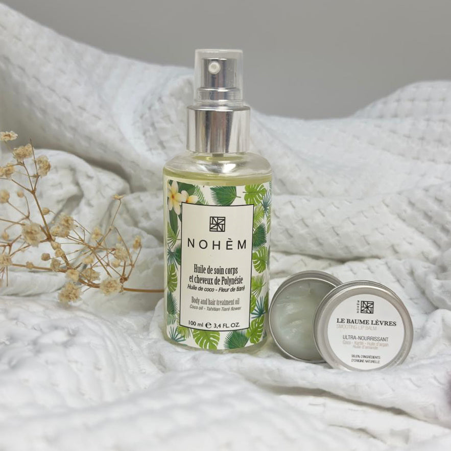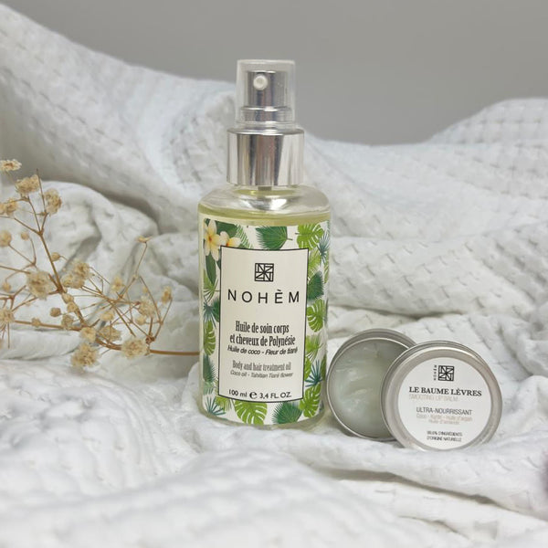 A nourishing oil with Polynesian coconut oil and a coconut lip balm, for soft skin and irresistible lips.