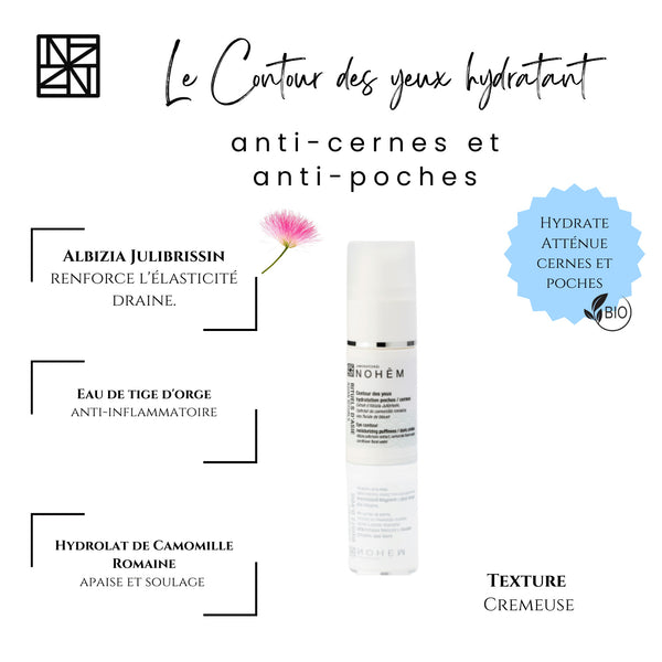 Le soin contour des yeux hydratant poches/cernes de Nohèm est 100 % naturel et bio, formulé sans parabènes et spécialement conçu pour la peau sensible du contour de l’œil.
