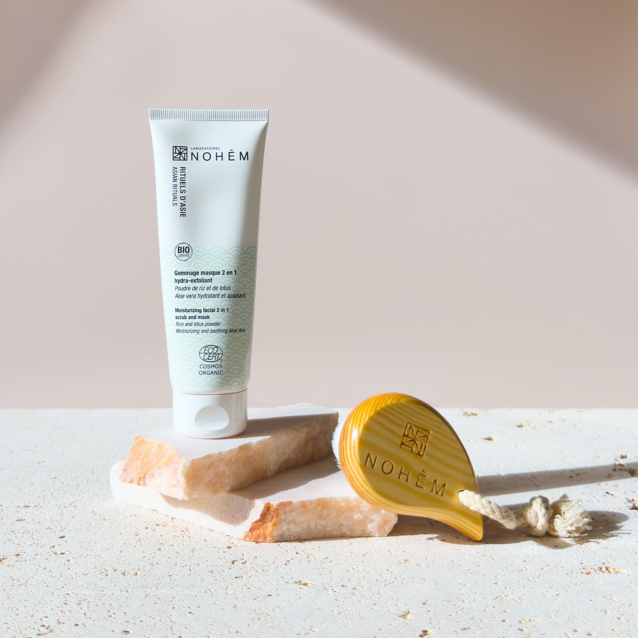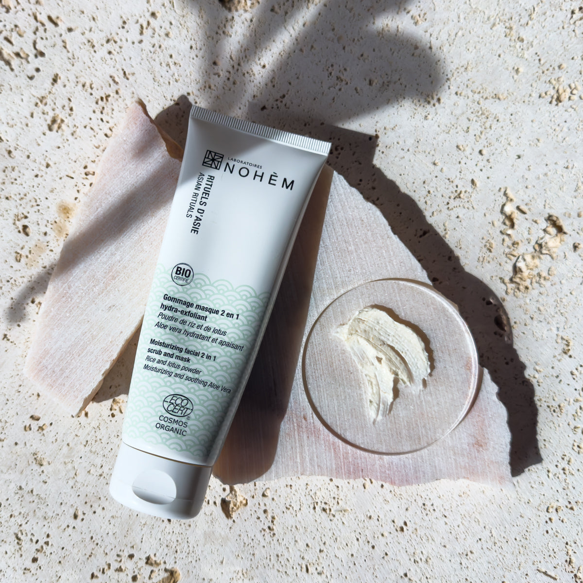 Appliquer en légers massages (éviter le contour des yeux) pour exfolier la peau puis laisser poser 5 minutes en masque. Emulsionner puis rincer. Grâce aux vertus de la poudre de riz et de lotus, et de l'aloe vera, votre peau est éclatante, nourrie et hydratée.